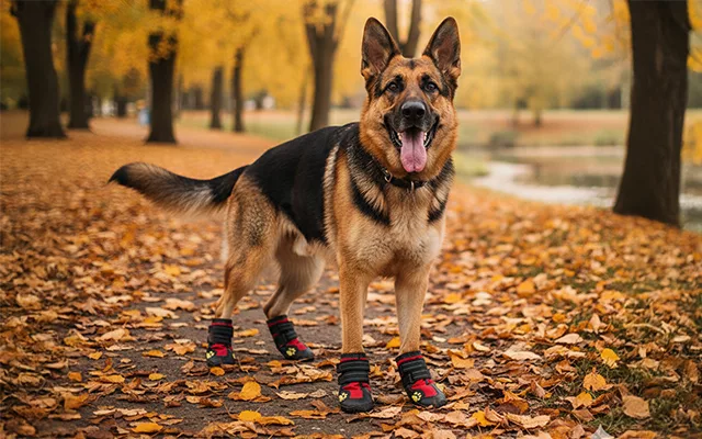 Ich habe die Schuhe meinem Golden Retriever für einen regnerischen Parkbesuch angezogen. Seine Pfoten blieben sauber und der Halt war super, sogar auf rutschigen Wegen.