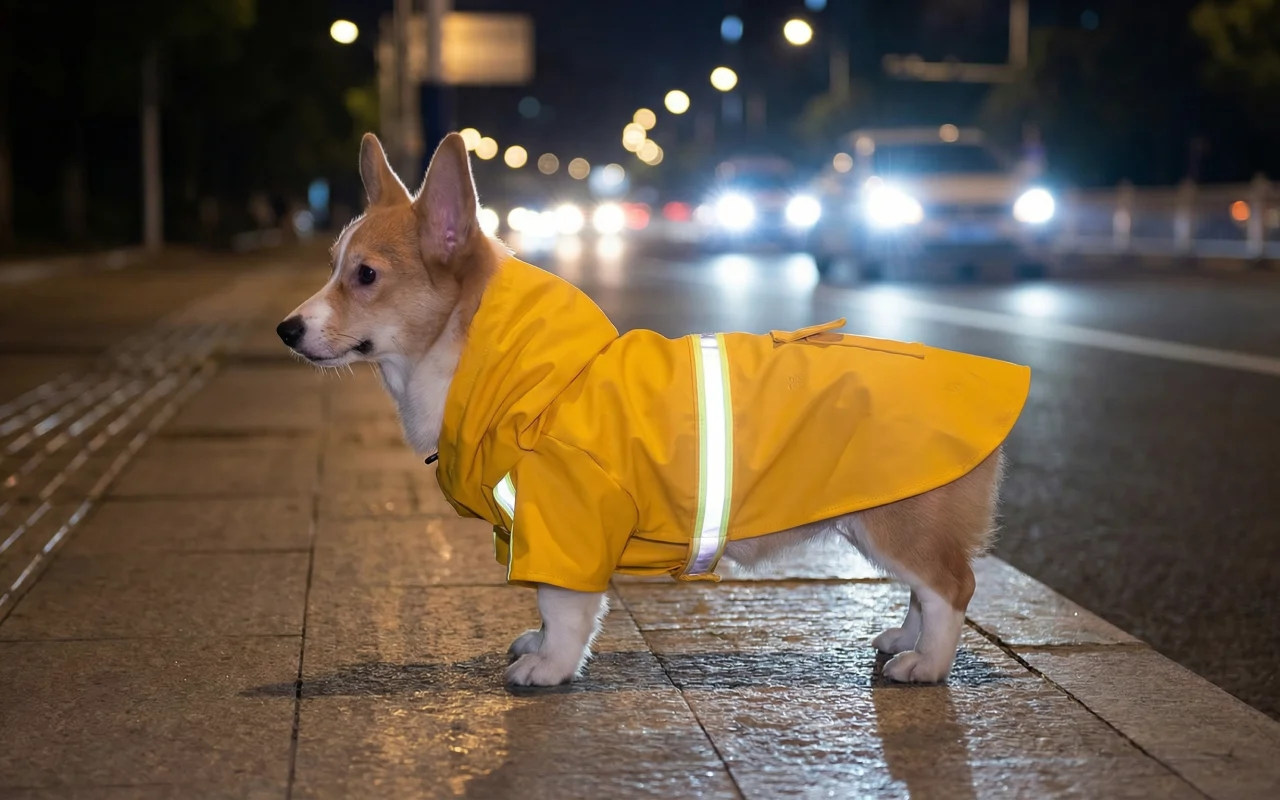 Unsere Abendspaziergänge sind jetzt viel einfacher. Der Mantel hält Daisy warm und trocken, und Autos können sie deutlich sehen. Die Kapuze bleibt auf dem Kopf, ohne sie zu stören.