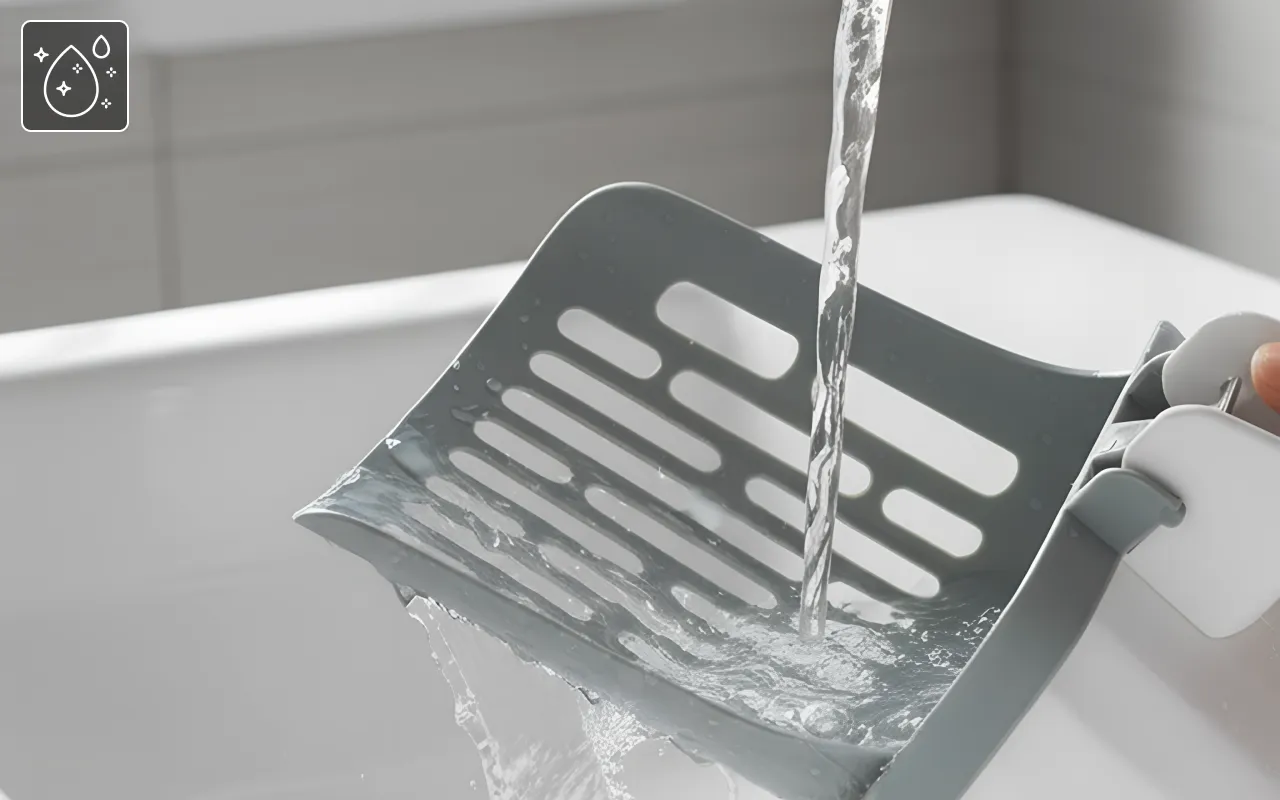 Das robuste Material lässt sich nach der Benutzung in Sekunden abspülen. Keine komplizierten Teile oder Schritte – einfach reinigen und fertig.