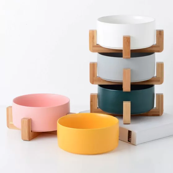 Der Napf und der Ständer bestehen aus umweltfreundlichem, lebensmittelechtem, langlebigem Keramik- und Bambusmaterial, das sehr leicht zu reinigen ist. Erhältlich in verschiedenen angenehmen, matten Farben: weiß, grün, grau, gelb und rosa. Diese Näpfe sind so hell und klar in einer Farbe, dass Sie sie schnell finden können, auch wenn Ihr Hund sie versteckt.