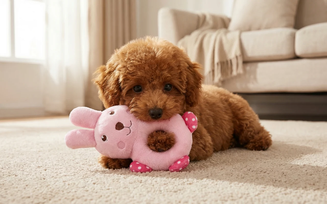 Leuchtende Farben ziehen den Blick meines Welpen auf sich, und er kaut fröhlich darauf herum.