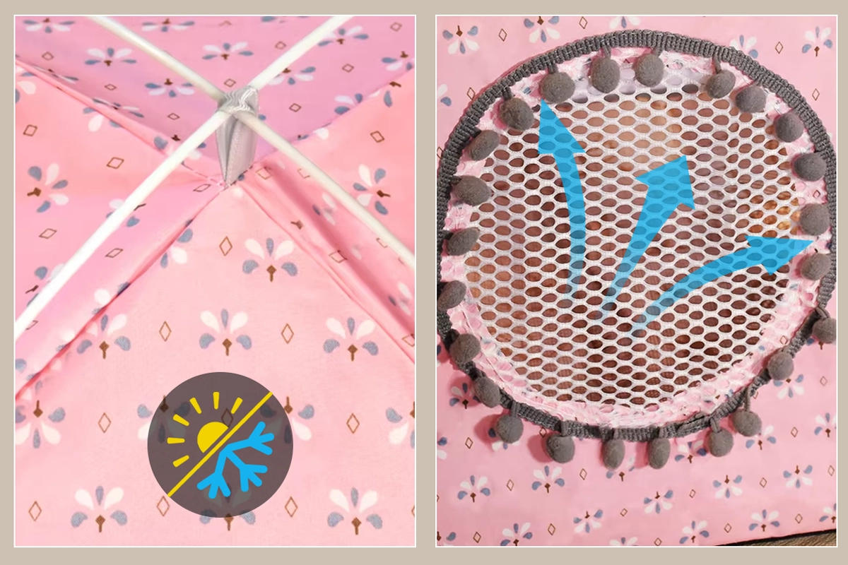 Atmungsaktives Material hält Haustiere an warmen Tagen kühl. Isolierte Wände sorgen außerdem für Wärme, wenn die Luft kühl wird.