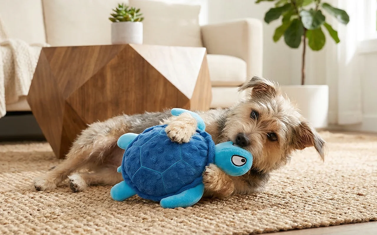 Ich habe diese niedliche Schildkröte für meinen Hund gekauft und er ist besessen davon. Das Quietschen und das knisternde Geräusch beschäftigen ihn, während ich das Abendessen koche.