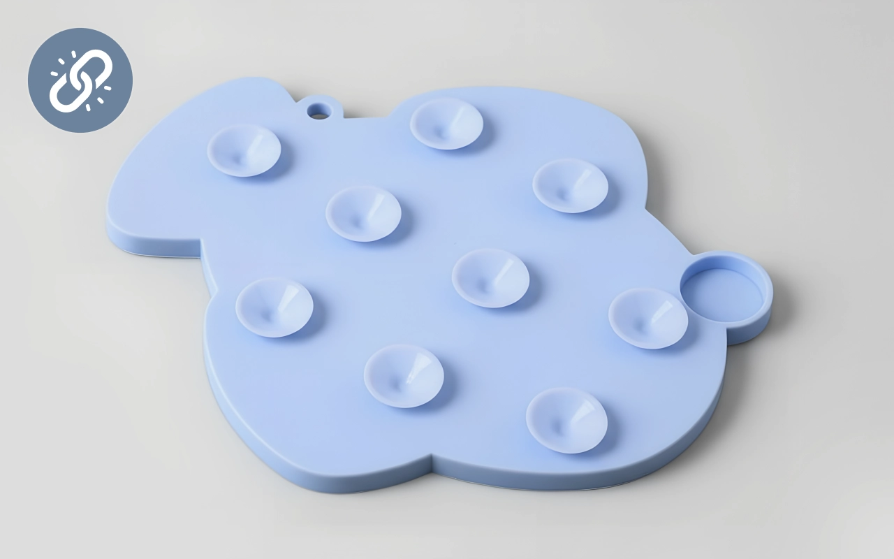 Der Saugnapfboden hält die Primdog Matte fest an Ort und Stelle auf Oberflächen. Das Futter bleibt enthalten, sodass Ihr Zuhause mühelos ordentlich bleibt.