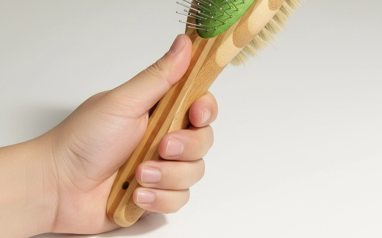 Halten Sie die Bürste sicher, auch bei langen Pflegesitzungen. Der Bambusgriff liegt natürlich in der Hand und bleibt stabil.