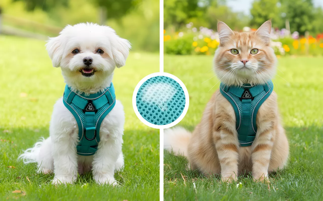 Atmungsaktiver Stoff hält Haustiere bei jeder Aktivität im Freien kühl. Verstellbare Gurte sorgen für eine perfekte Passform bei Katzen und Hunden.