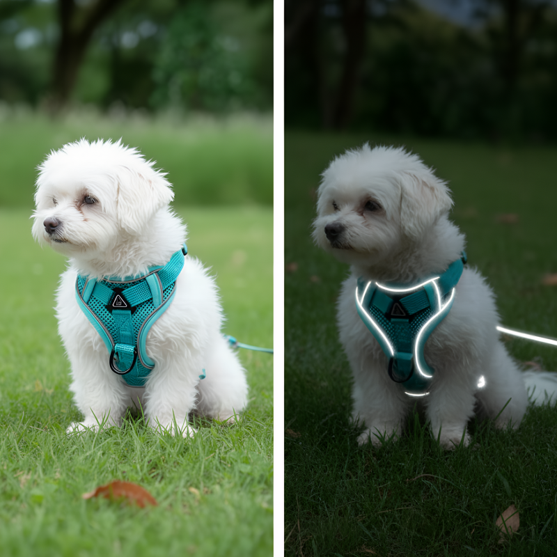Reflektierende Nähte helfen Haustieren, nach Sonnenuntergang sichtbar zu bleiben. Robuste Verschlüsse geben Sicherheit – egal wohin das Abenteuer führt.