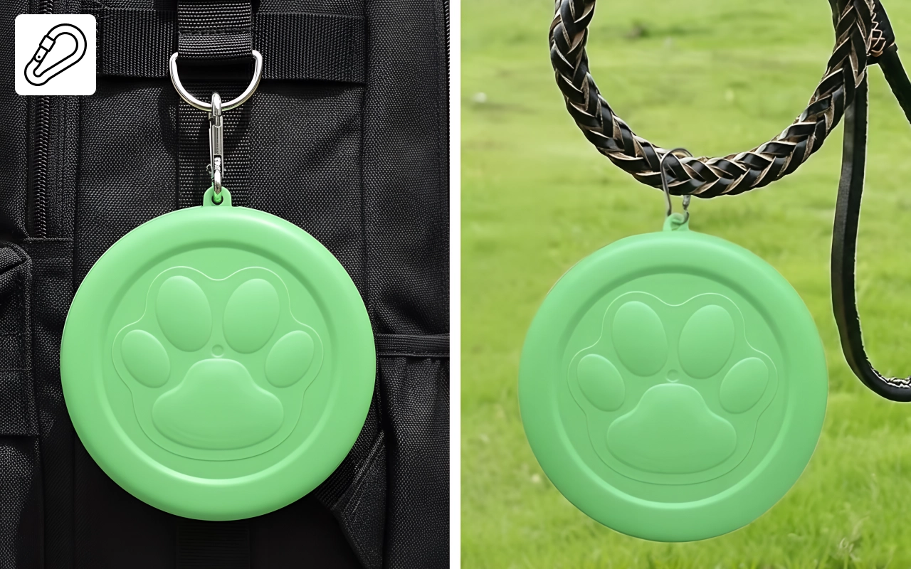 Befestigen Sie die Primdog-Schüssel in Sekunden an Leinen oder Rucksäcken. Ihre Hände bleiben frei, während Sie das Nötigste griffbereit haben.