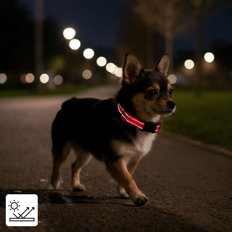 Reflektierende Nähte leuchten auch bei schlechten Lichtverhältnissen hell. Haustiere bleiben für Autofahrer und Radfahrer in der Dunkelheit sichtbar.