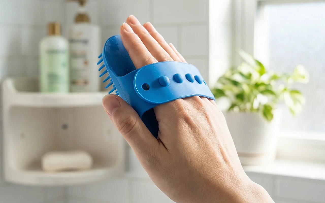 Kleine Gumminoppen entspannen die Haut beim Schrubben und lösen sanft Verspannungen. Haustiere erhalten zusätzliche Verwöhnung und das Waschen wird zum gemeinsamen Moment.