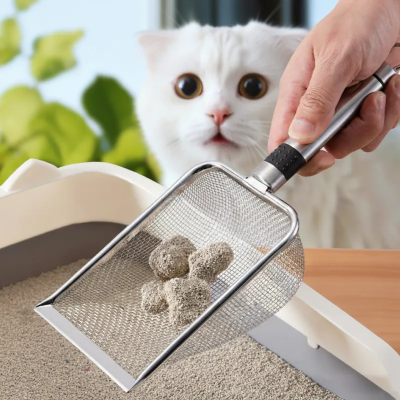 Glatte Metalloberfläche verhindert, dass Schmutz haften bleibt. Die Hände bleiben sauber und Gerüche verschwinden schnell aus dem Katzenklo-Bereich.