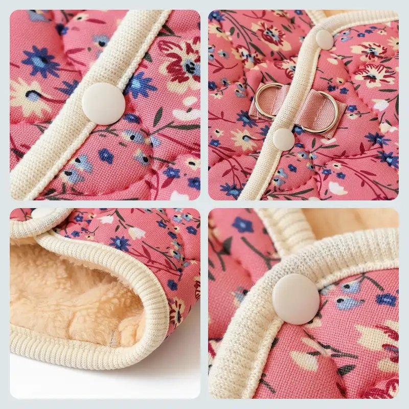 Primdog sorgt mit cleverem Design für Komfort an kühlen Tagen. Weiches Fleece-Futter lässt Hunde sich draußen schnell geborgen fühlen. Jede Jacke hat sichere Knopfverschlüsse für einfaches Anziehen. Hübsche Blumendesigns bringen Charme in jeden Ausflug.