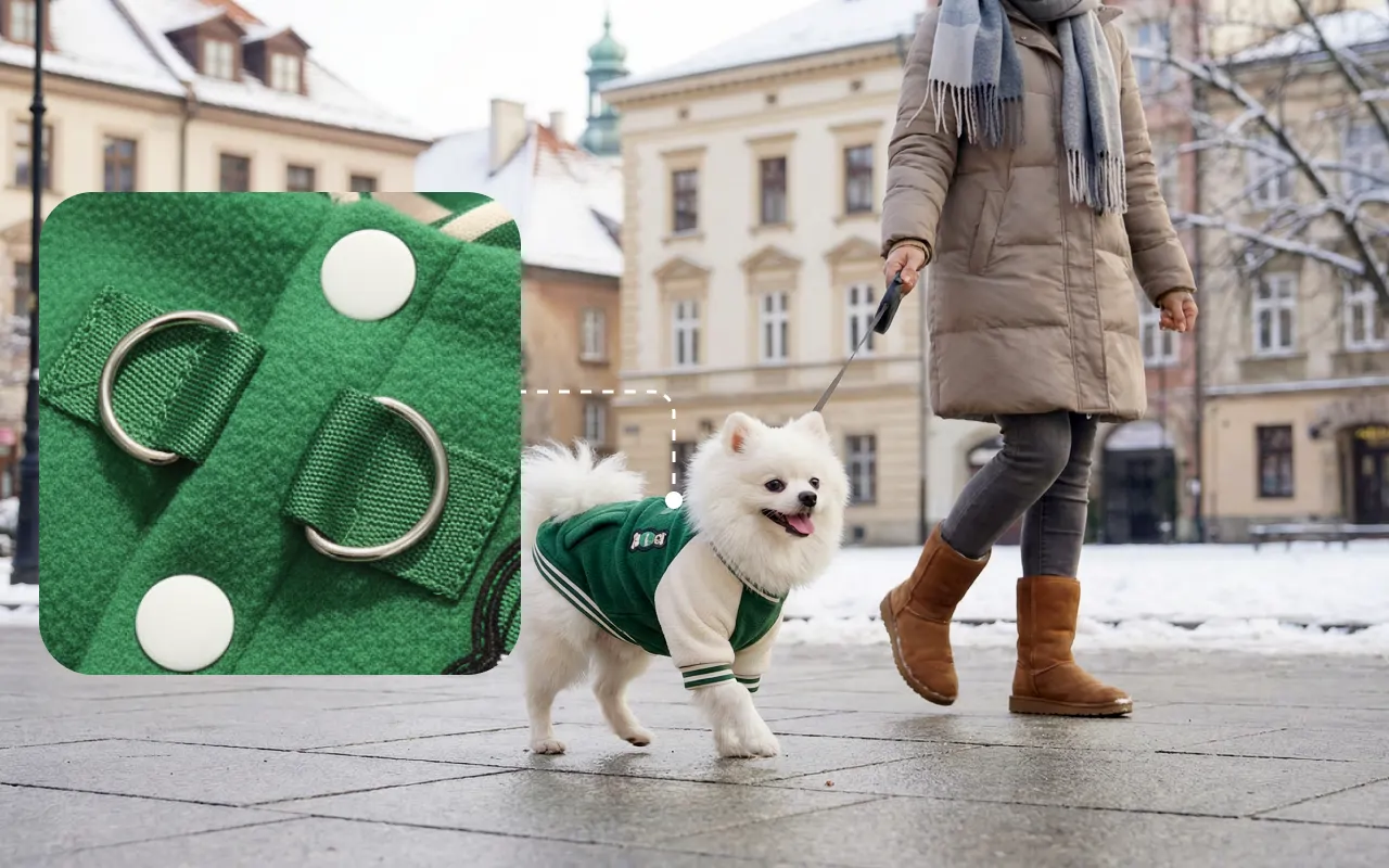 Befestigen Sie die Leine am stabilen Ring für sichere Spaziergänge. Kein zusätzliches Geschirr – mehr Zeit gemeinsam draußen.