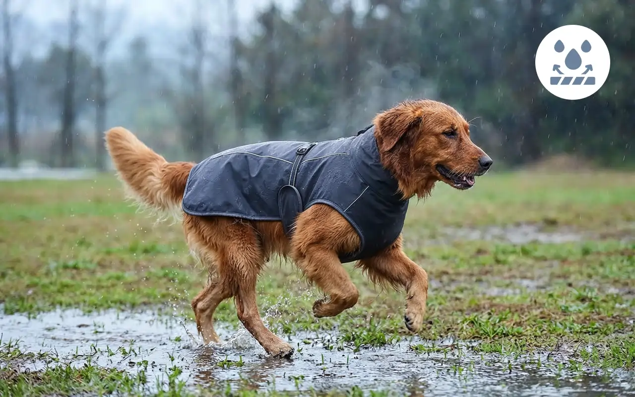 Stoffe verhindern, dass Wasser nach Regenschauern oder Schnee durchdringt. Hunde bleiben überall trocken, glücklich und bereit für Spaß.