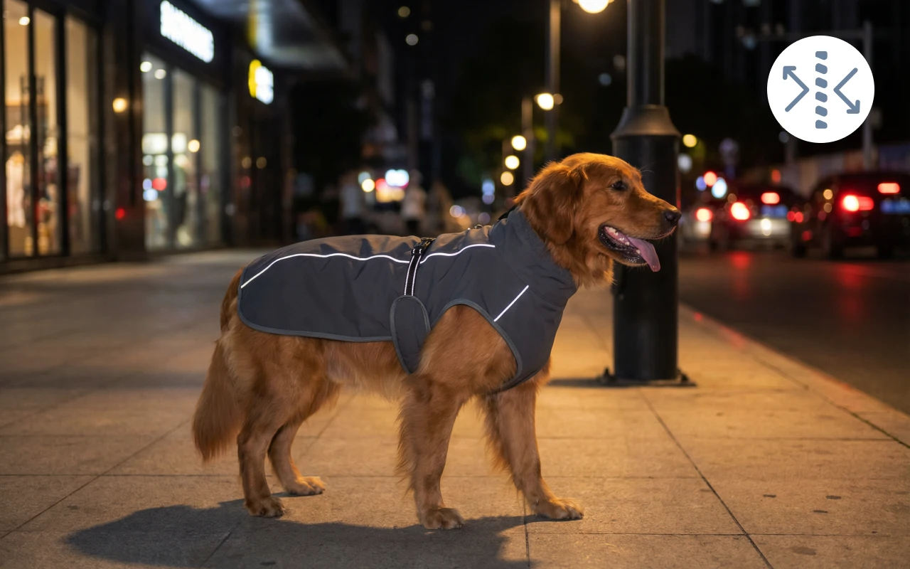 Reflektierende Besätze leuchten hell, wenn Autoscheinwerfer vorbeifahren. Abendspaziergänge werden für Besitzer und verspielte Hunde sicherer.