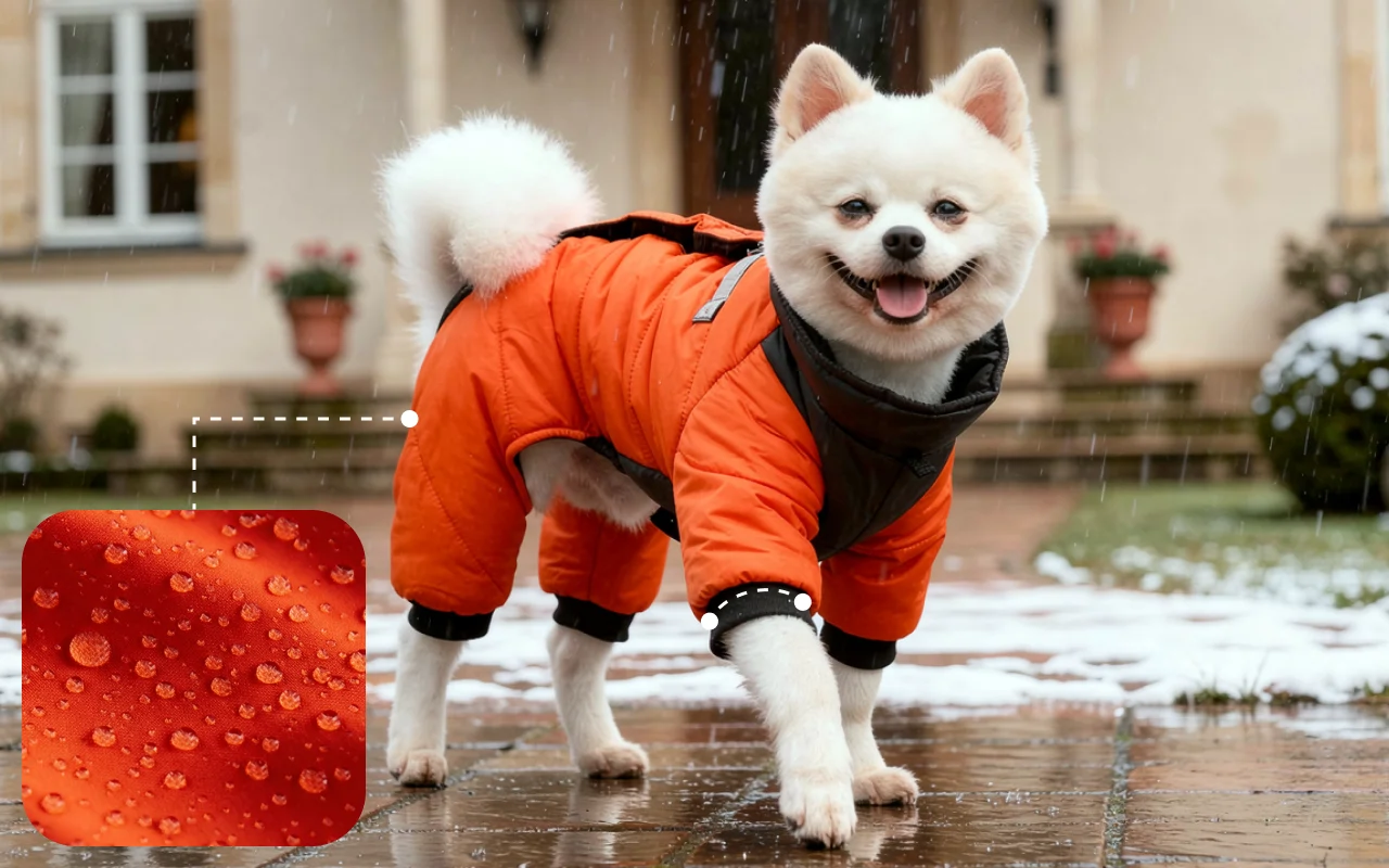 Wasserdichtes Gewebe hält das Fell selbst bei Regen trocken. Winddichte Bündchen halten die Kälte ab, sodass die Abenteuer nie enden.
